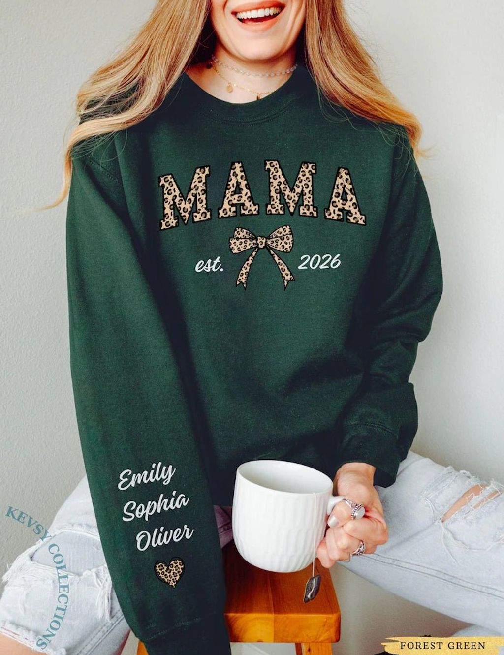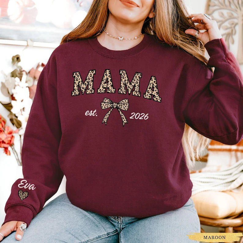 Custom Leopard Mama Sweatshirt With Kid Name On Sleeve, Personalized Mom Sweatshirt, Gift For Mom, Mothers Day Gift,Mama Est Year Sweatshirt